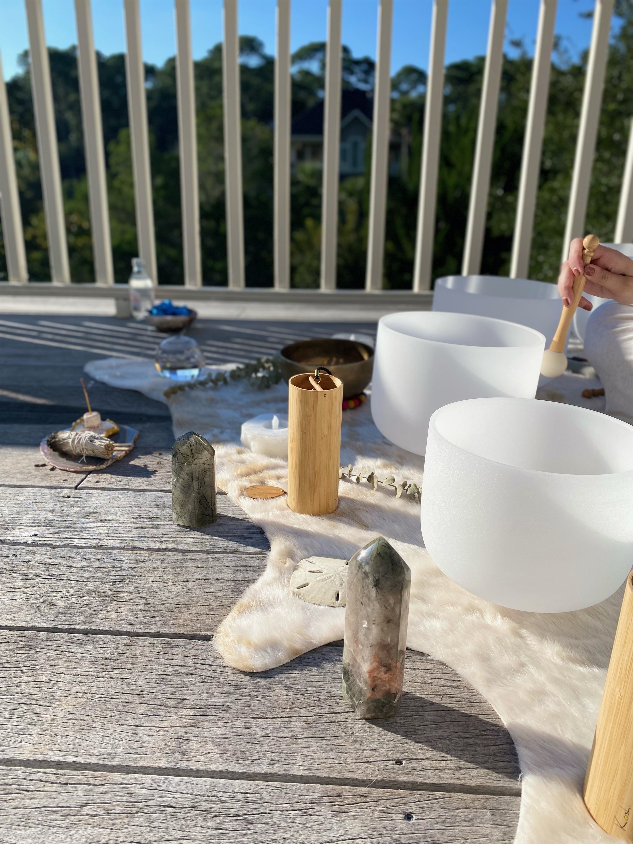 In the morning, our yoga instructor and sound healer arrived early to set the space before the first guest stepped outside. Mats, blankets, and bolsters were laid out on the upper deck, with the sound healing altar arranged alongside. Crystal singing bowls, Tibetan brass bowls, crystals, sage, and eucalyptus, all set up with intention.